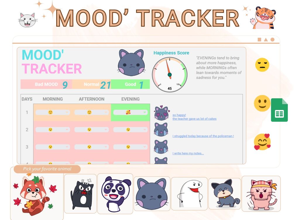 This Google Sheets tracker boasts 31 tabs, one for each day, allowing detailed recording from morning to evening. Seamlessly linked to a main dashboard, effortlessly review your mood journey. Plus, witness real-time updates on a global happiness score from 0 to 100, providing instant insights into your overall well-being.