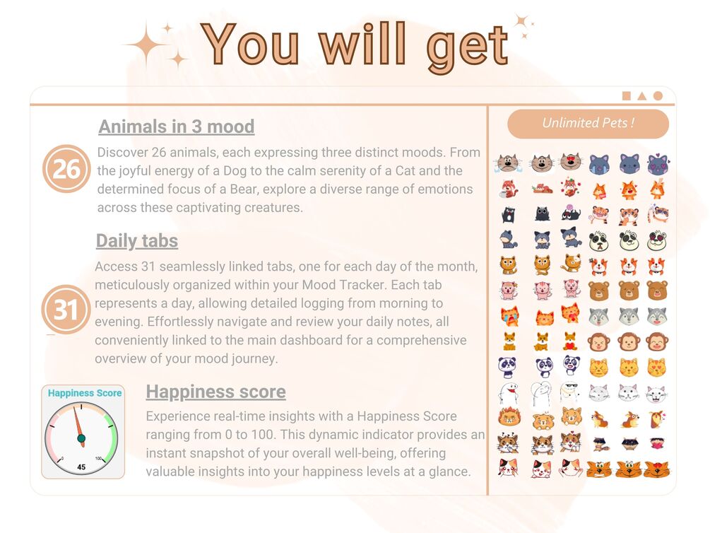 Transform your mood tracking experience with our innovative Mood Tracker, designed to revolutionize your daily emotional insights! Picture this: as you log your feelings each day, adorable pets representing different moods grow, making your journey truly captivating.