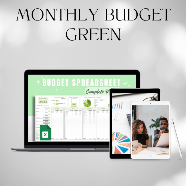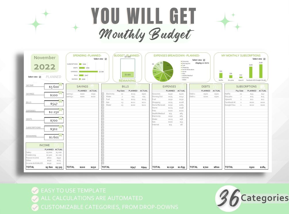 Green Monthly Budget, Calendar, Microsoft Excel, Transactions Tracker, Budget Planner, Savings, Budget Tracker, Debt Snowball