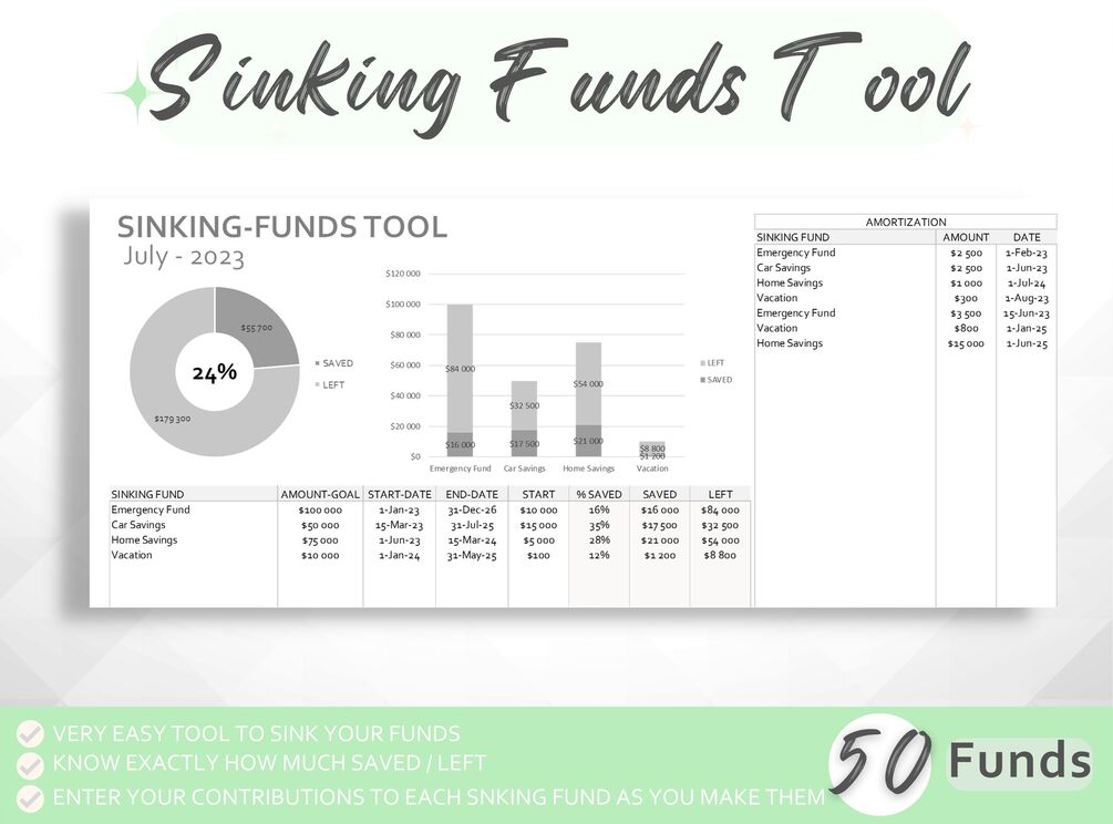 5- Sinking Funds tool: allowing in very simple steps to make contributions and see your progress in sinking. A large range of categories is included.