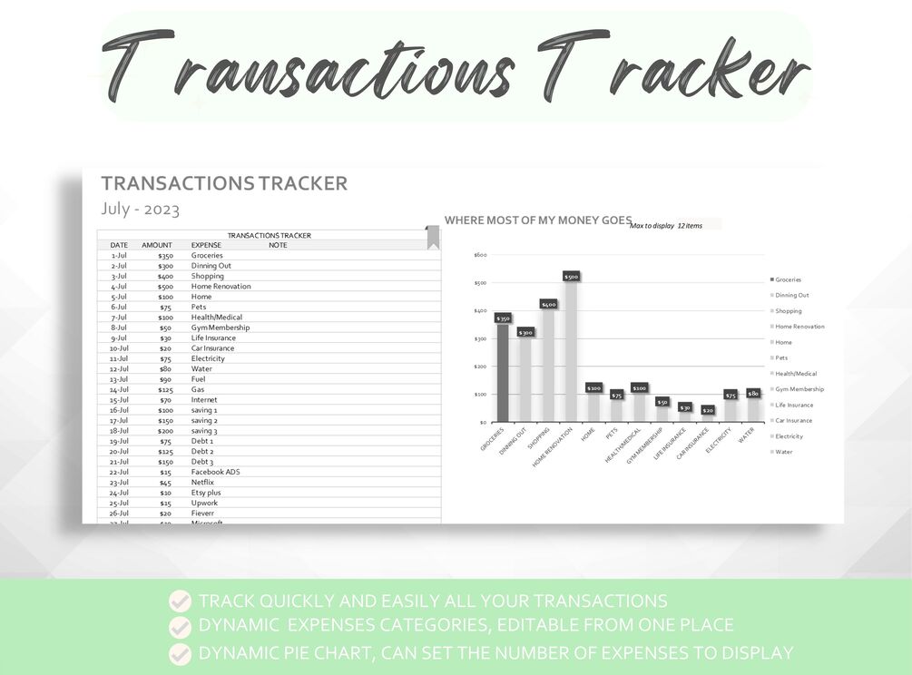 3- Transactions Tracker: Tracks all your savings: expenses, debts, bills and subscriptions. Categories are selectable and editable.