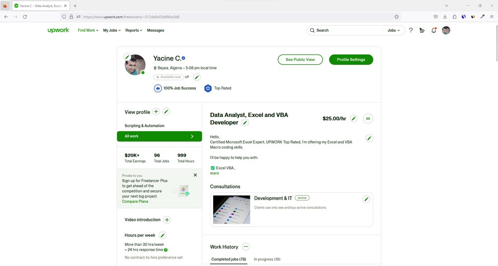 Hi, I'm Yacine Chettout, a certified Excel Expert from Microsoft Office (see the Expert Badge). With over six years of experience, I have consistently achieved top-rated status on Upwork, maintaining a 100% client satisfaction rate. You can view my Upwork profile here.