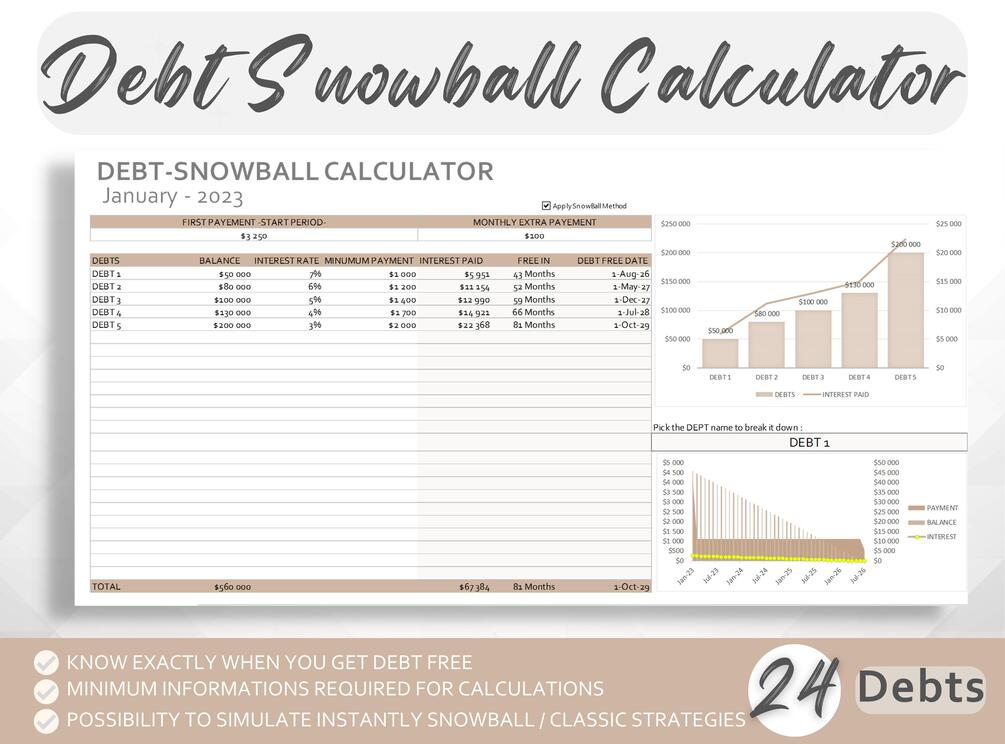 4- Debt SnowBall simulator: a simple tool applying the snowball strategy to get debt free quickly. A checkbox to apply or not the snowball strategy is available in the worksheet.
