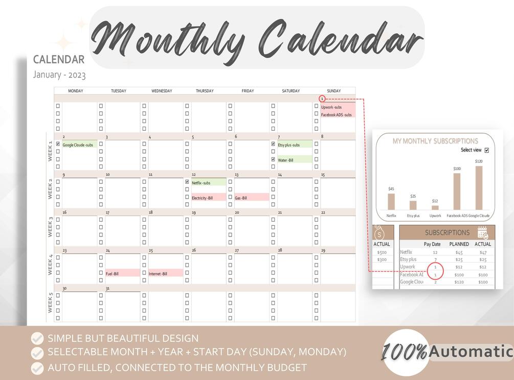 2- Monthly Calendar: connected to the Monthly Budget. According to the year and month and start day you picked in the begining => This calendar is fully automatic.